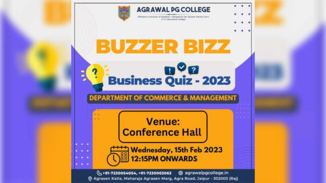 The Department of Commerce and Management has Conduct a Business Quiz on 15th February at Agarwal PG College. The Event was presumably aimed, Knowledge of Business Concepts and Practices.