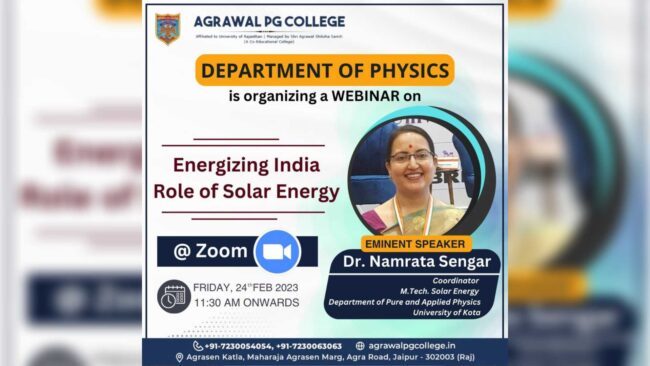 Department of Physics is Organising a Webinar on Energizing India Role of Solar Energy on 24th February at AGRAWAL PG COLLEGE. Dr Namarata Sengar had very effectively explained the significance of use of solar energy to all the curious minds of M Sc Physics of our college.