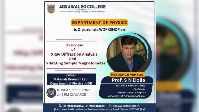 Department of Physics at Agrawal PG College has Organized a Workshop on X-ray Diffraction Analysis and Vibrating Sample Magnetometer. This Workshop Provides a Comprehensive Overview of these Techniques and Offers Attendees the Opportunity to Gain Hands-On Experience in their Applications.