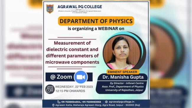 Department of Physics has organized a Webinar on “Measurement of dielectric constant and different parameters of microwave components” on Zoom, Dr. Manisha Gupta (Dy. Director Infonet Centre, Asso. Prof., Department of Physics, University of Rajasthan) has presented her expert views.