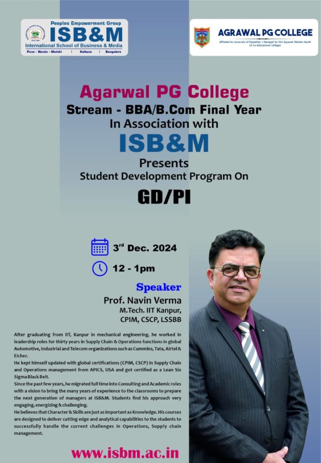 Glimpses of Excellence! Agarwal PG College (BBA/B.Com Final Year) in collaboration with ISB&M proudly presents a Student Development Program on GD/PI. Empowering futures with skills for success!