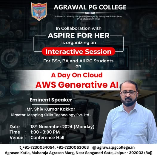 Agrawal PG College, Jaipur, in collaboration with Aspire for Her, proudly organized an engaging and insightful workshop titled “A Day On Cloud – AWS Generative AI.” This event brought together bright minds and future innovators to explore the transformative power of AWS Generative AI technologies.