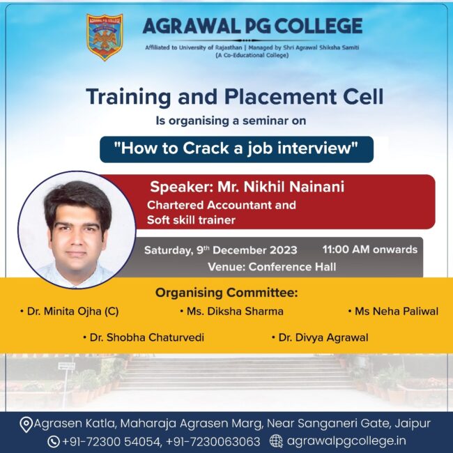 Elevate your interview game with insights from distinguished Chartered Accountant and Soft Skill Trainer, Mr. Nikhil Nainani. Organized by the Training and Placement Cell, this event is your gateway to career success. Don’t miss out on the seminar that could shape your professional future!