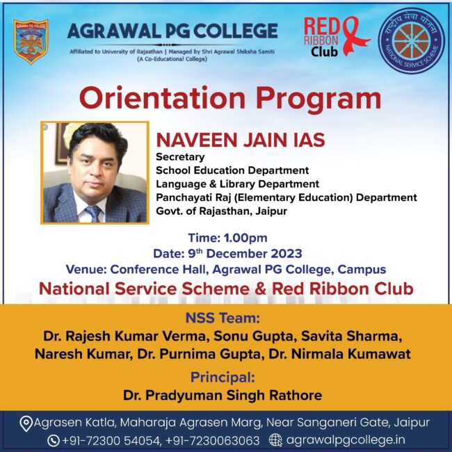 Agrawal College’s NSS Orientation Program, featuring Mr. Navin Jain IAS as the chief guest, emphasized life goals and holistic development for students. Organized by NSS Unit 1, 2, 3, and the Red Ribbon Club, the event focused on self-discovery, social responsibility, and community service. The program, guided by Principal Dr. Praduman Singh Rathore and NSS…