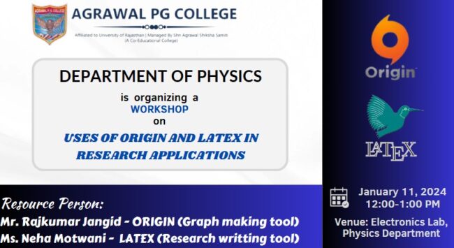 Unlocking the secrets of scientific precision! Department of physics is organizing a workshop on uses of origin and latex in research applications, Delve into the expertise of our resource persons, Mr. Rajkumar Jangid and Ms. Neha Motwani, as we navigate the realms of data visualization and document preparation.