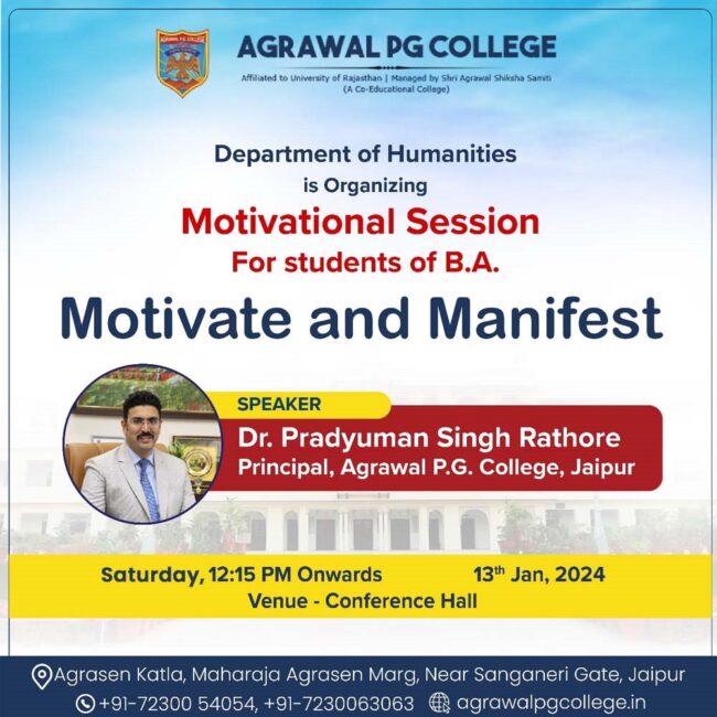 Unlock your potential with the Department of Humanities who organized motivational session on ‘Motivate & Manifest’ by the esteemed speaker, Dr. Pradyuman Singh Rathore. Ignite your passion and fuel your dreams.