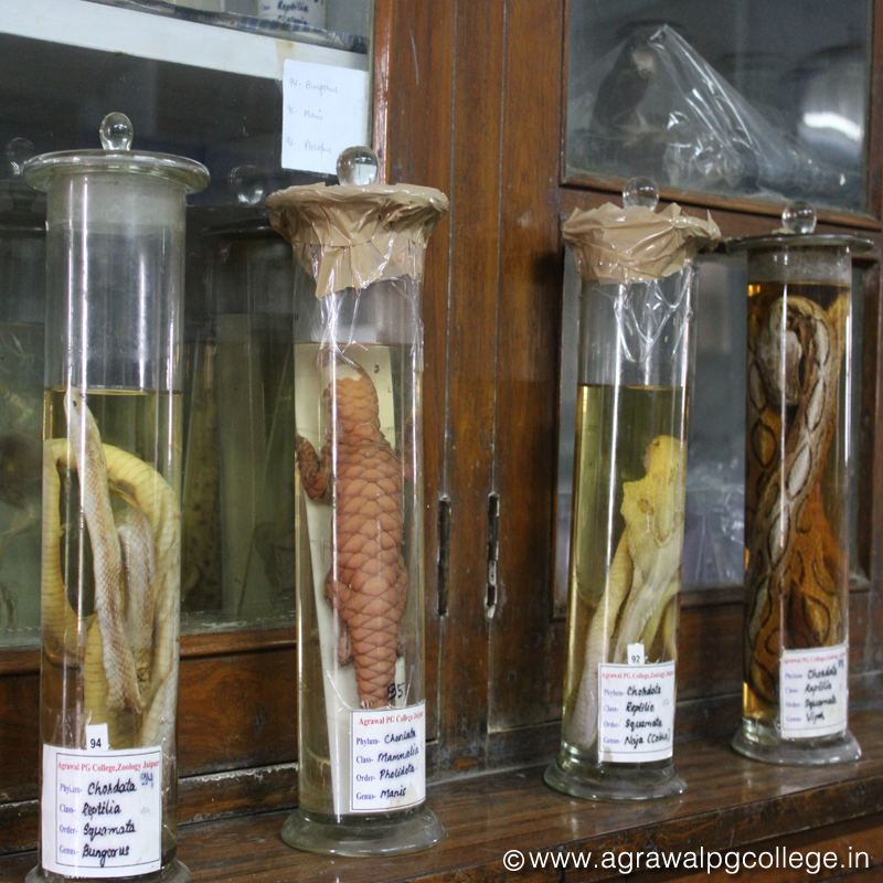 Zoology Lab: The Department of Zoology one of the oldest in Jaipur is well equipped with ultra-modern facilities to cater to the modern practical knowledge and research The Museum houses several significant zoological specimens. Each is curated independently and categorized for easy identification. It has one of the largest specimen collections in Rajasthan with more than 300 specimens.