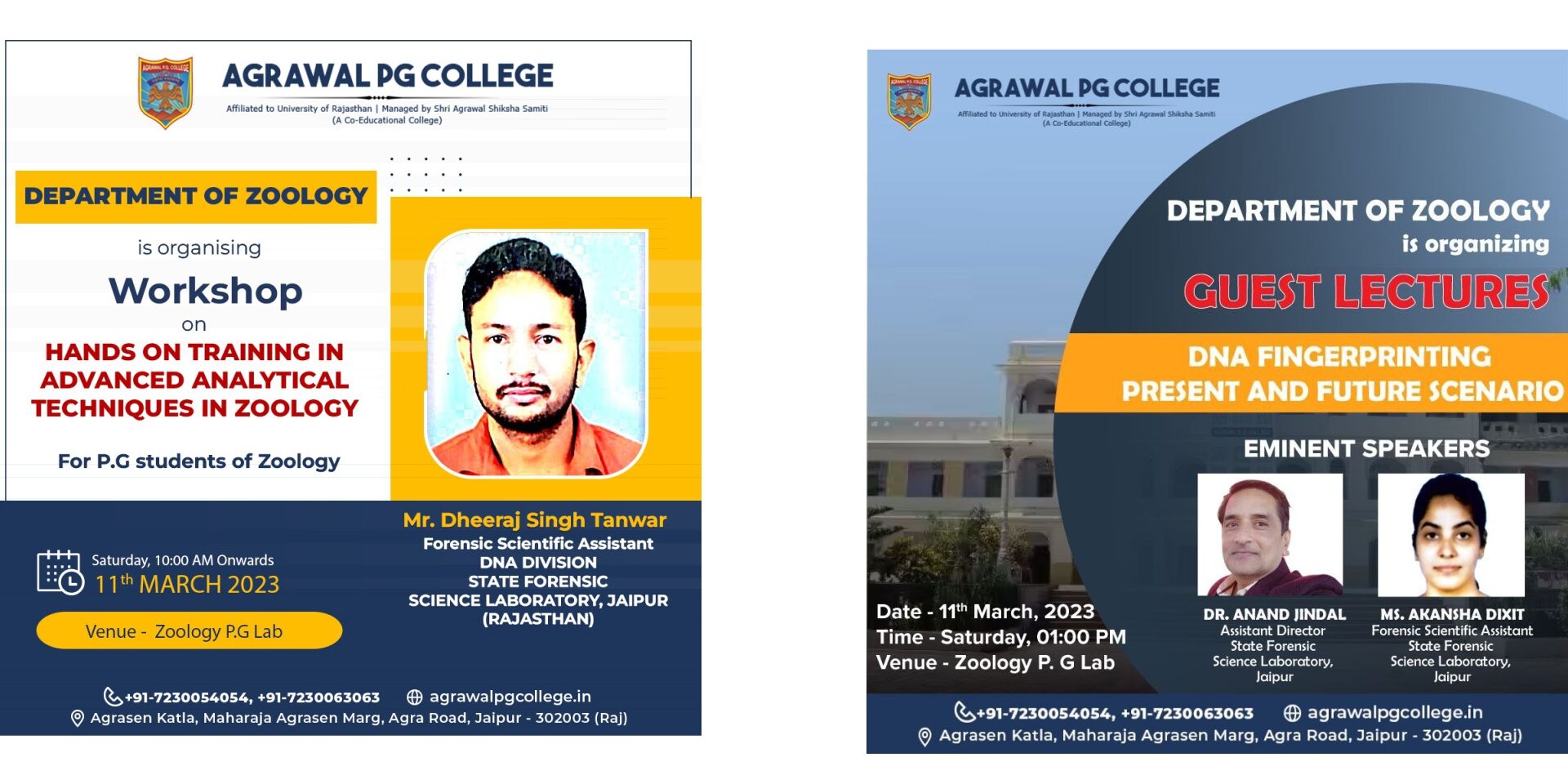 The Department of Zoology has organised a Workshop on ‘HANDS ON TRAINING IN ADVANCED ANALYTICAL TECHNIQUES IN ZOOLOGY’ by Forensic Scientist Mr. Dheeraj Kumar Tanwar & “DNA FINGERPRINTING PRESENT AND FUTURE SCENARIO” by the Eminent Speakers Dr. Anand Jindal and Dr. Akansha Dixit on 11th March