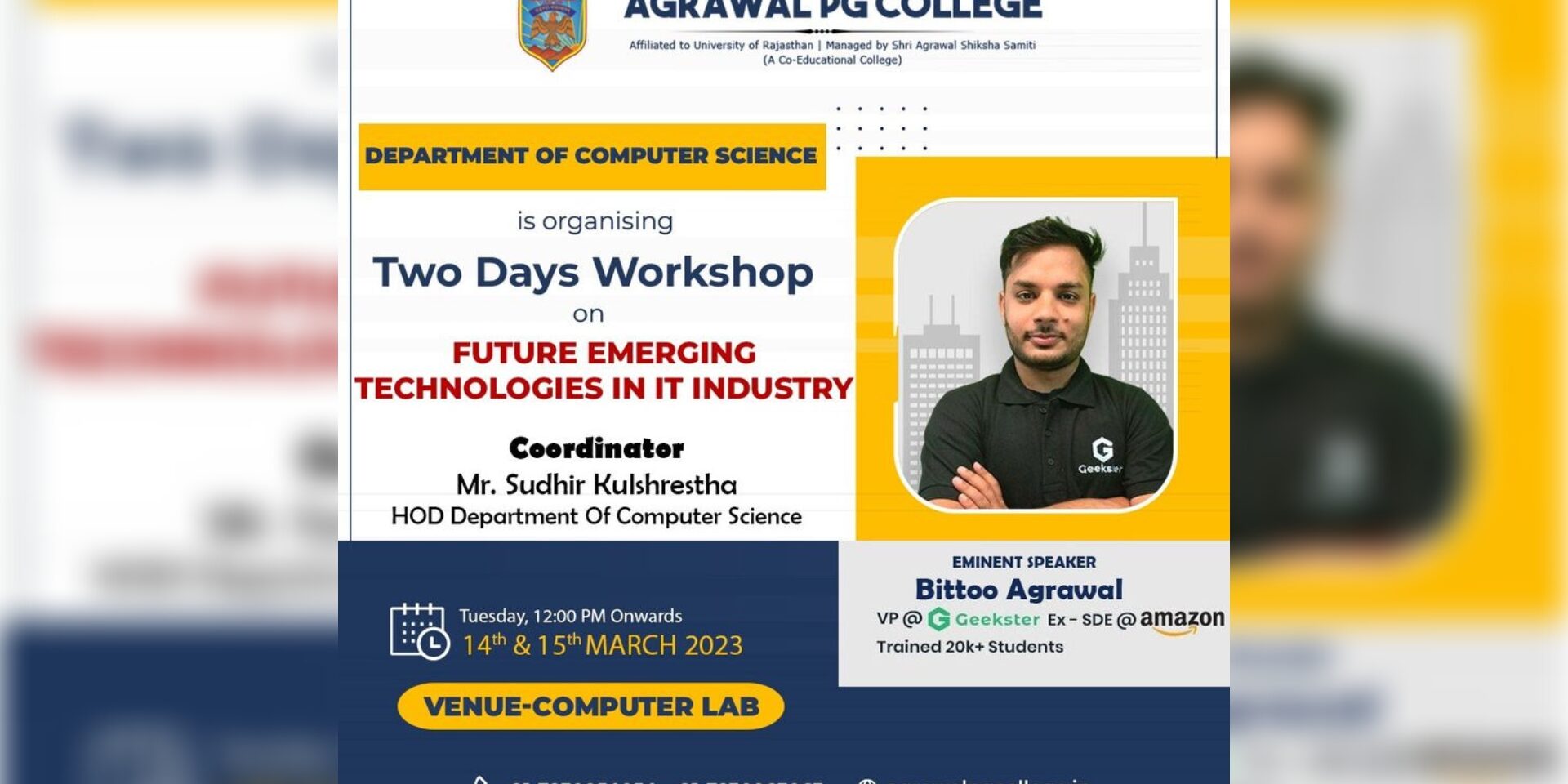The Department of Computer Science has organised two-day workshop on ‘Future Emerging Technologies In The IT Industry by the Eminent Speaker Mr. Bittoo Agrawal at Agrawal PG College