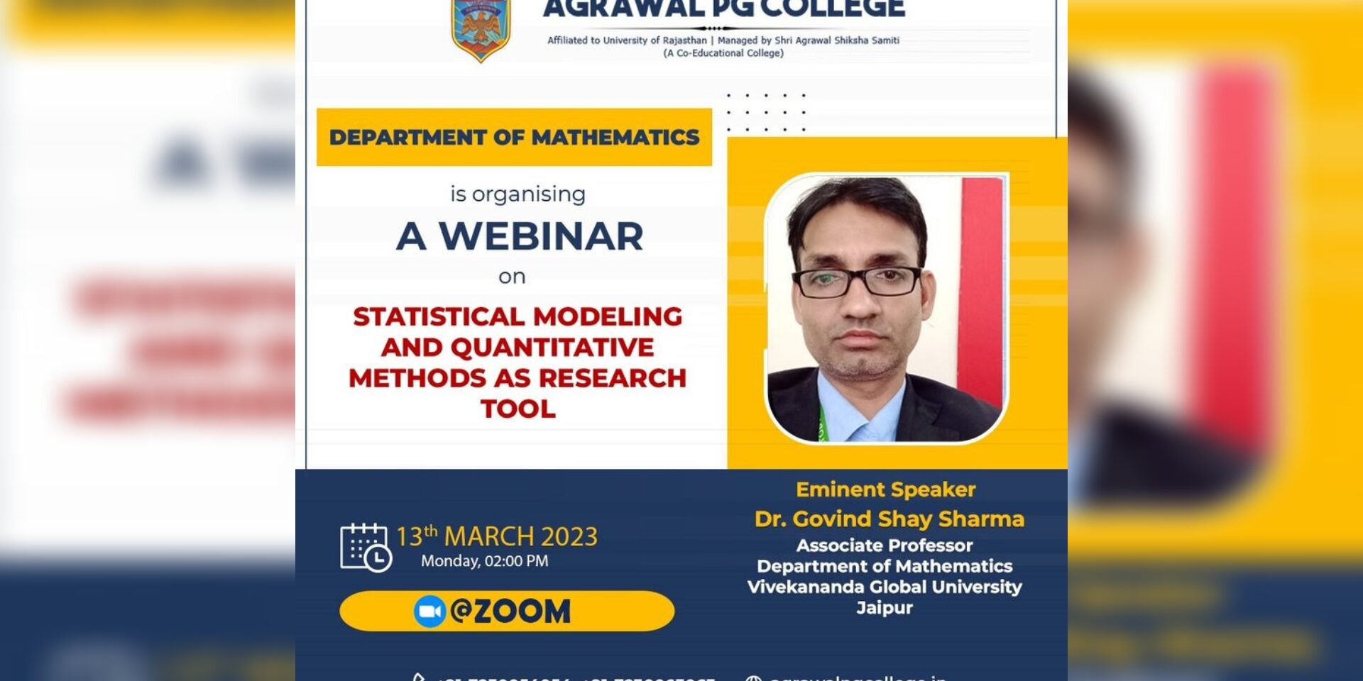 The Department of Mathematics has organised a webinar by the Eminent Speaker Dr. Govind Shay Sharma at Agrawal PG College. The webinar aims to provide insights on how statistical modeling and quantitative methods can be utilized as research tools.